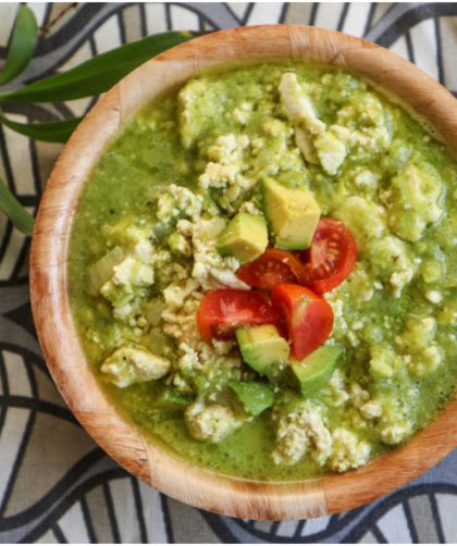 Ingredientes: (2 personas) 350 grs. de tofu extra firme 10 tomates verdes 1 diente de ajo ¼ de cebolla 1 chile serrano 1 rama de …