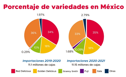De acuerdo con la Comisión de Manzanas Washington, nuestro país ha importado 11.15 millones de cajas de las 122 millones producidas durante la temporada 2020-2021, siendo la variedad Red Delicious, la de mayor consumo, con un 35%, seguido por Gala con 33% y Golden Delicious con 18%.