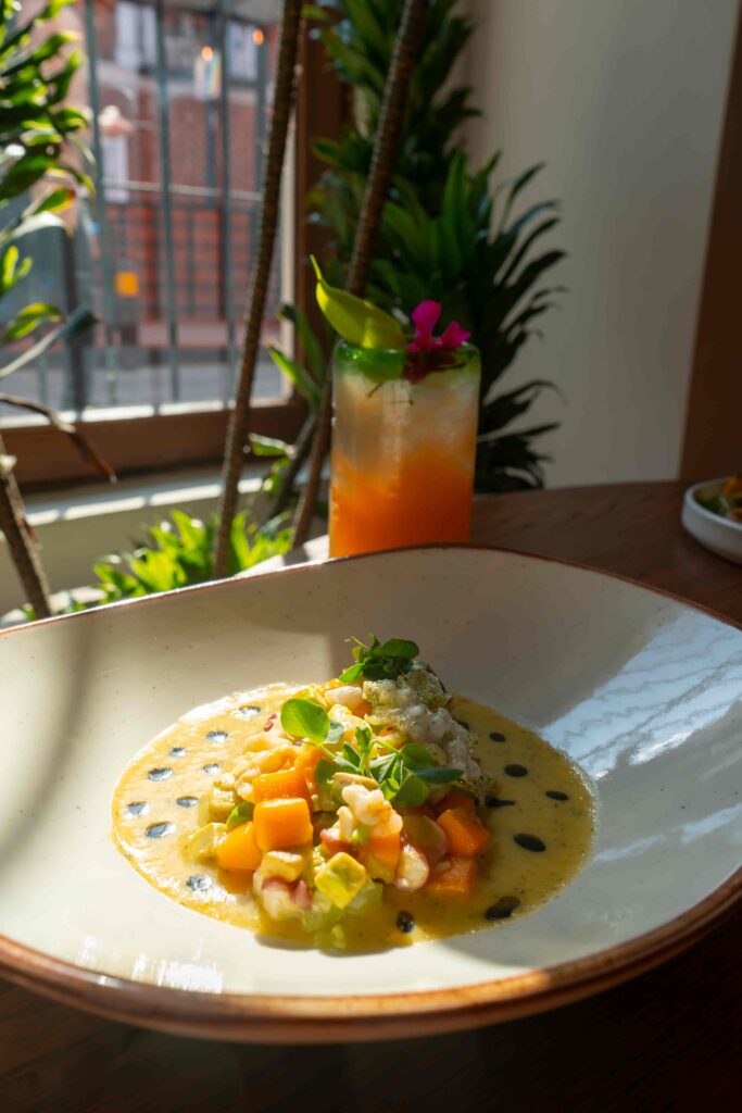Ceviche, mezcla de mariscos con leche de tigre de mango y coco