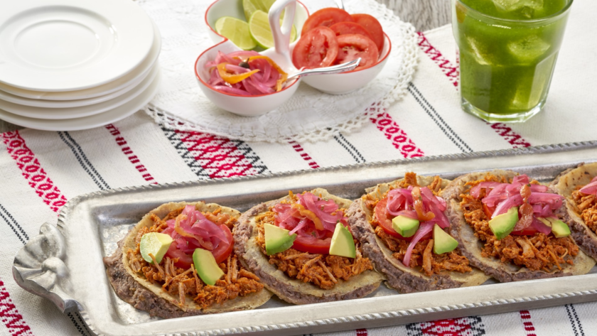 coronadas con cochinita, cebolla morada y chile habanero. Reflejan la riqueza cultural de