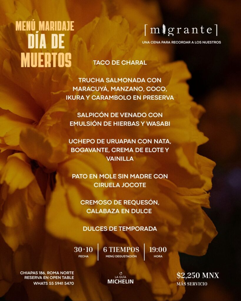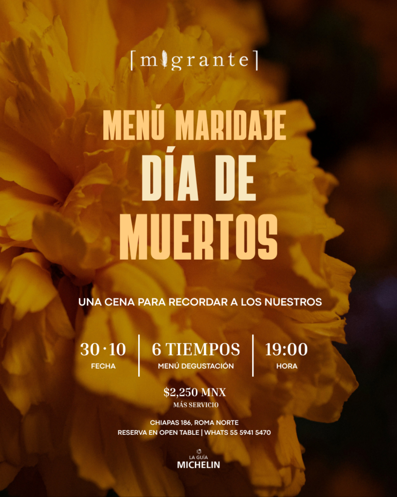 Este año, Fernando Martínez Zavala, chef de Migrante, dedica su menú de Día de Muertos a reconectar con su origen y con los sabores que marcaron su historia. Nacido en Uruapan, Michoacán, el cocinero ha hecho de la migración y el mestizaje su sello, explorando distintas culturas sin perder de vista la raíz mexicana.