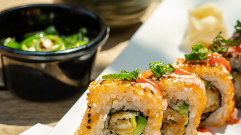 Por eso en este aniversario Creamos el Pepinky, contiene rollo de alga marina con arroz: envuelto con masago y un toque de ajonjolí mixto relleno con kushiague de camarón salsa Teriyaki y aguacate: Topping Mayo, schiracha y cebollín.