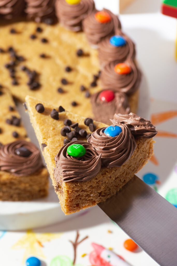 Cookie Cake Galleta decorada con crema sabor chocolate, chispas de chocolate y m&m’s.