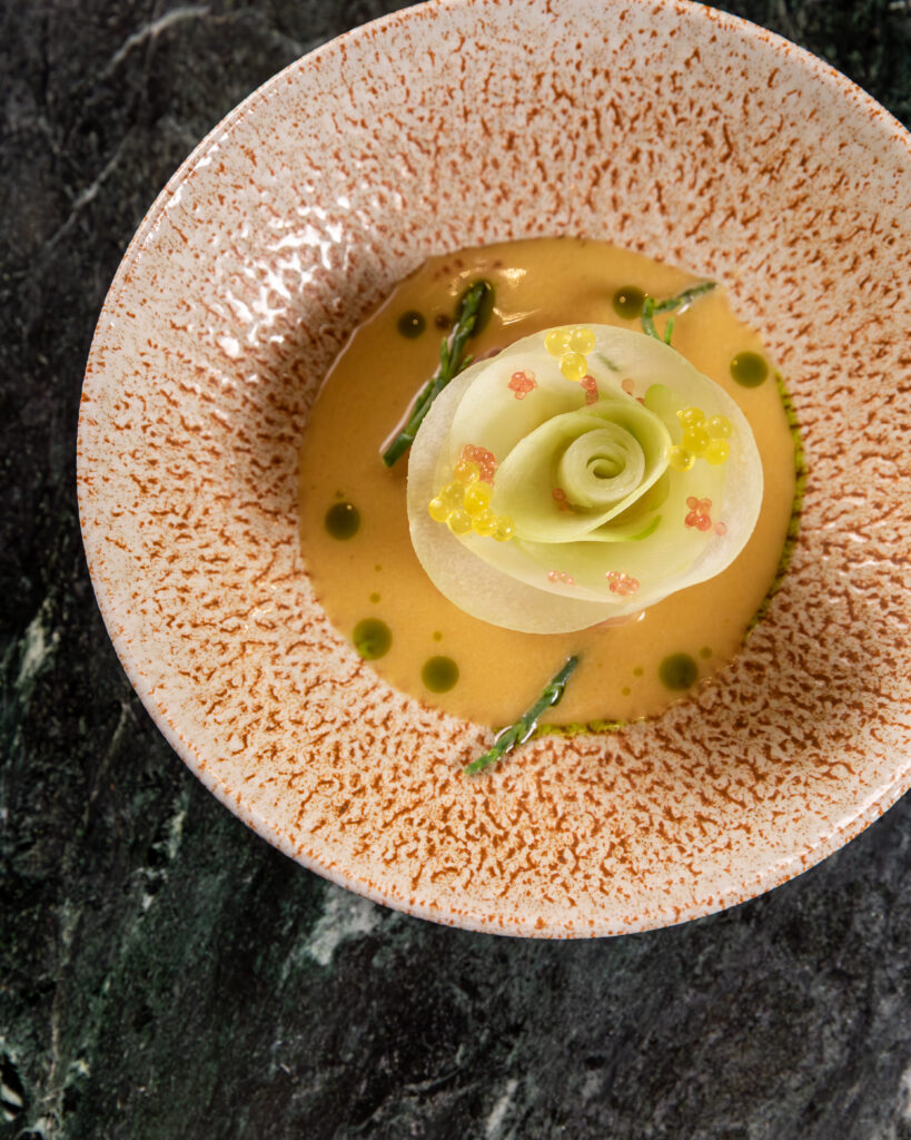 Filete de lenguado al sartén, salsa de mantequilla y chile serrano, puré de espárrago al grill y espárrago envuelto en calabaza.