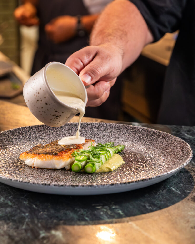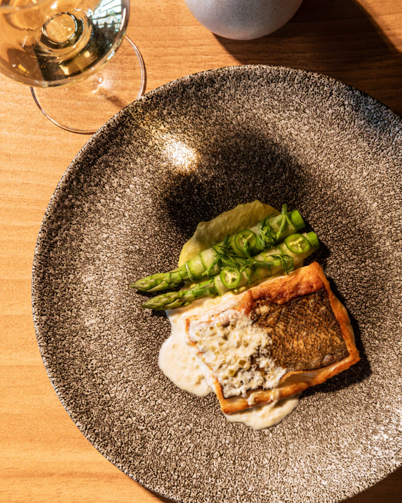 Pesca del día, beurre blanc de chile serrano y espárrago