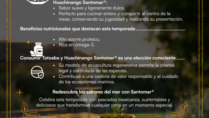 ● Para quienes disfrutan sorprender en Navidad y Año Nuevo, Santomar® invita a descubrir la Totoaba y el Huachinango de cultivo, dos opciones que aportan sabor, versatilidad y una elección consciente a la mesa festiva.
