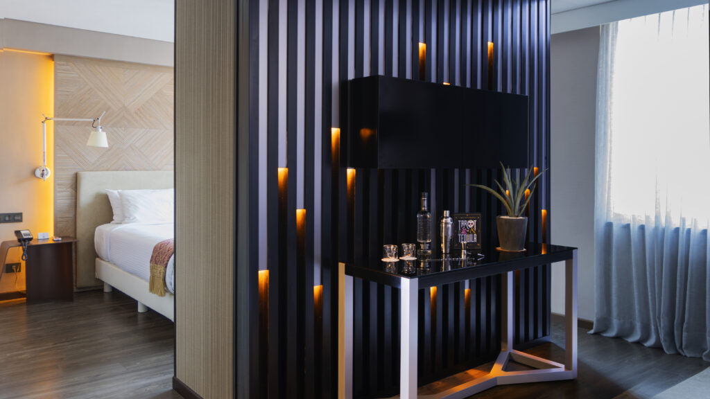 Estos espacios, ideados con el objetivo de generar experiencias memorables, cuentan además con elementos exclusivos y de fabricación nacional, entre los que se encuentran los escritorios y la decoración de los muros. Además ofrecen un Snack Bar con alimentos acordes a las bebidas que se ofrecen, un Hangover Kit para la recuperación de aquellos que disfrutan de toda una noche de fiesta y un Bar Setup con botellas, sales, shaker que despertarán la faceta de mixólogo de cualquier persona.
