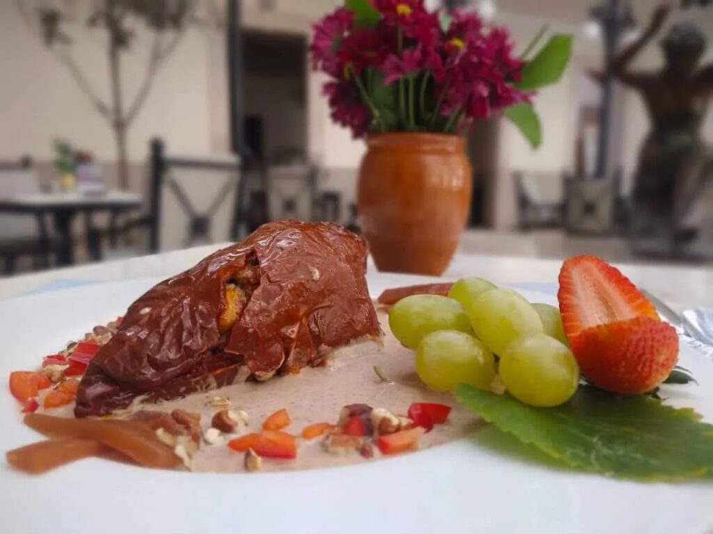 Este platillo creado hace 20 años aproximadamente, refleja los sabores emblemáticos del estado: la guayaba rosa, el membrillo y las uvas; ingredientes que se combinan en un guiso de dos tipos de carne con el que se rellena un chile seco ancho. Esta interesante y propositiva mezcla da como resultado un platillo de sabor agridulce especiado que inunda el paladar.